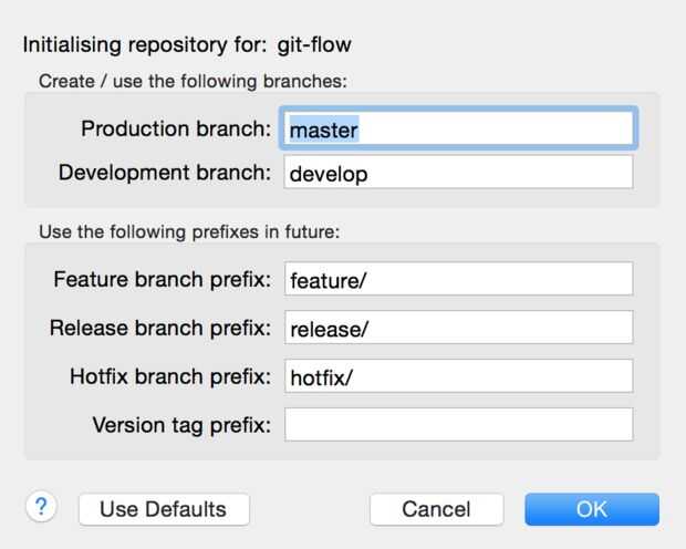 Si esta pantalla aparece significa flujo de git no ha sido configuración todavía. Haga clic en aceptar en la configuración predeterminada.