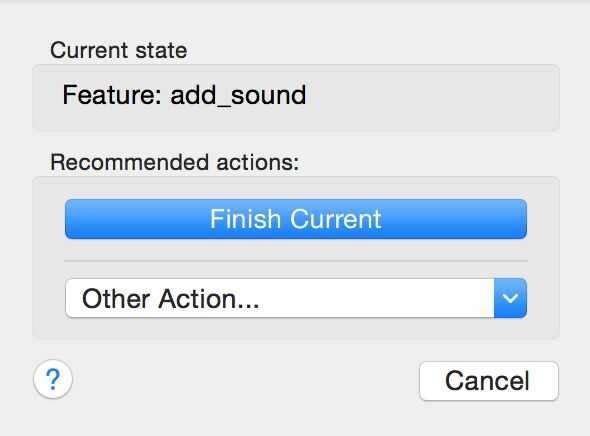 Una vez que se ha implementado la función puede clic en Git flujo otra vez y haga clic en acabado actual. Esto combinará la rama de la función a desarrollar.