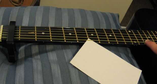 Para comprobar la tensión en el cuello, primero asegúrese de que la guitarra está afinada correctamente. Luego coloque un capo en el primer traste y presione hacia abajo la primera cuerda en el traste 14. Compruebe el espacio libre en el traste 6. Usted debe ser capaz de encajar sólo un pedazo de pesado cartulina (índice o tarjetas) en la cadena en el 6to traste. Apriete la barra del braguero para disminuir la separación. Afloje el alma para aumentar la separación