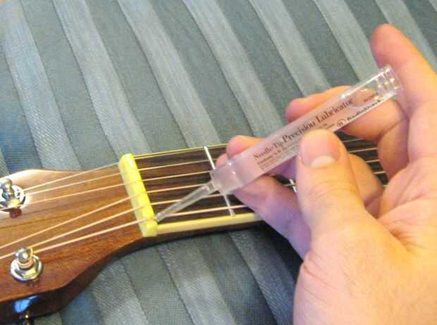 Una vez que se ajusta la tuerca te recomiendo lubricantes las ranuras con un aceite de máquina de teflon base. Esto evitará que las cuerdas madriguera abajo más lejos en la tuerca como se sintonizan. También evita las rebabas y captura contra la cadena, provocando que se rompiera al afinar la guitarra.