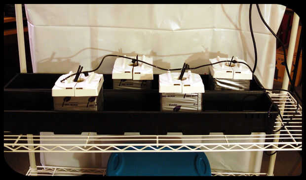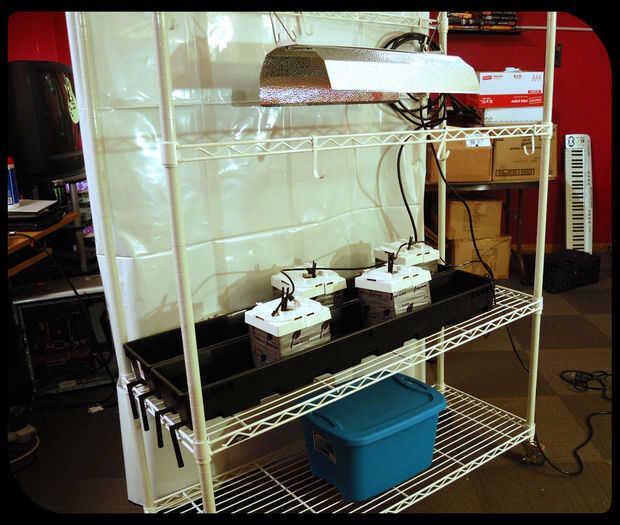 Bajando el estante del medio, podemos acomodar grandes plantas como tomates, pimientos y tal con nuestra configuración de goteo. Para sujetar las raíces de estas plantas grandes, cambiar las losas de lana de roca de la configuración del goteo pequeños cubos de lana de roca grande con tapas de plástico para evitar la acumulación de algas. Desde que colgamos nuestra luz de 400w con ganchos de trinquete, podemos elevar la luz como las plantas crecen... y nuestra funda reflectante Velcro hace este proceso mucho menos doloroso.