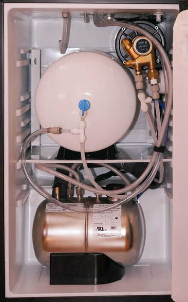 El tanque del RO sirve para 2 propósitos. Se acumula el agua RO creado (siendo que es un proceso lento) y asegura que el agua puede alimentar la bomba grifo/carbonatación con la presión. Sin esto su suministro de agua sería un simple goteo el agua filtrada es creado. Este tanque está incluido con el sistema del RO.