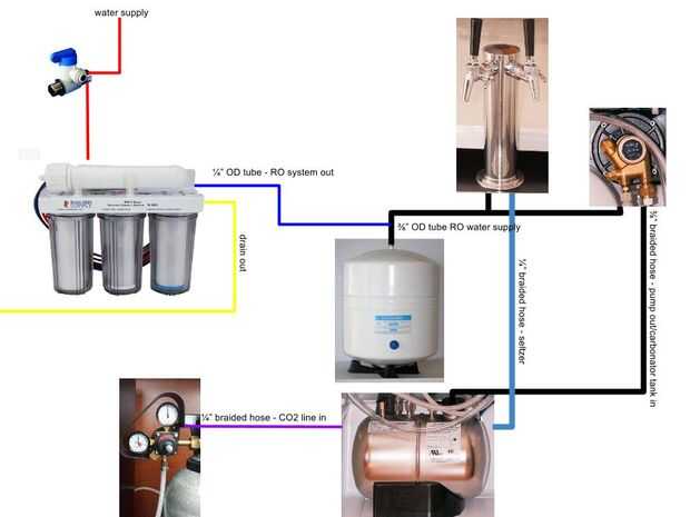 Con mi configuración tengo el 1/4" OD tubo (azul) desde el sistema del RO teed y la transición a 3/8" tubería OD en el tanque del RO y carbonatador bomba entrada de la línea. El carbonatador manual recomienda un mínimo 3/8" manguera de ID para el suministro de agua pero hasta ahora no estoy encontrando problemas. Esto puede ser porque el tanque de presión está conectado a la bomba dentro de la nevera (parte superior derecha) con una longitud corta del tubo. La longitud corta significa menos resistencia para el flujo de agua. Inicialmente quise poner la bomba fuera de la nevera para mantenerla a temperatura ambiente pero el motor y la bomba pueden ser bastante ruidosos. Muchos establecimientos comerciales tienen una sala para albergar todo el equipo de back-end y aislar el ruido, este no es el caso para mí que estaba considerando construir una caja MDF forrada de plomo con aislamiento de lana mineral. En un entorno tranquilo, el ruido es más sensible por lo tanto con habitación disponible dentro de la nevera que decidí aprovecharla. No se puede recomendar pero simplifica mi EMC.* crea una solución limpia sencilla como solo 1 tubo conecta el sistema del RO a la nevera y un menor componente es encadenado por separado. Recinto hermético de la nevera sirve para aislar y contener el ruido. El motor se cuelga boca abajo con las correas de gancho de metal montadas en los pernos de la torre de cerveza y anclajes originales placa del evaporador de la nevera.