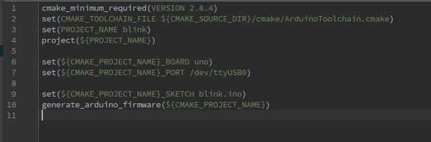 a los archivos más importantes uno ".ino» Dónde está el código para el Arduino y la segunda que lleva el nombre CMakeLists.txt donde tenemos que hacer una pequeña configuración. En la línea 6 configuración