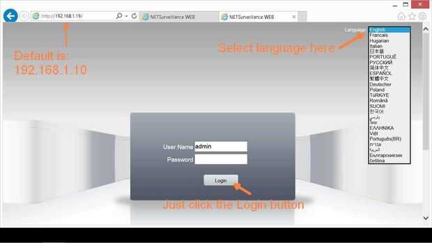 Esta cámara funciona mejor en IE, pero primero tendrá que ir a la configuración de seguridad y permitir que ActiveX rienda conseguir componentes de ActiveX de la cámara instalada. No se preocupe, su ningún virus o spyware. Una vez que se instala, solo deje que IE fijar la configuración de seguridad y la cámara se corriente su video que es el navegador o cualquier software de vigilancia. La dirección predeterminada es 192.168.1.10.
