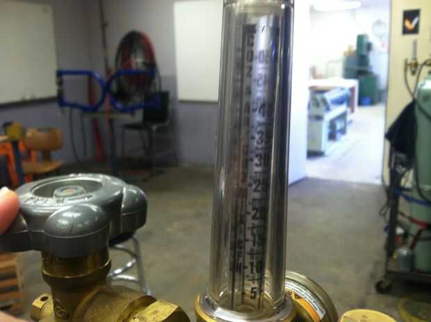 4) ajuste el flujo de gas a 15cfh tirando hacia abajo en el gatillo (de la pistola) mientras que al mismo tiempo abrir la válvula del regulador. Verás una bola de subida en el cilindro. Asegúrese de que el centro de la bola es alineado con 15cfh en la escala de mezcla de argón y CO2.