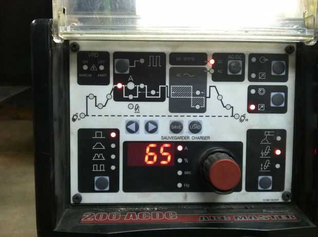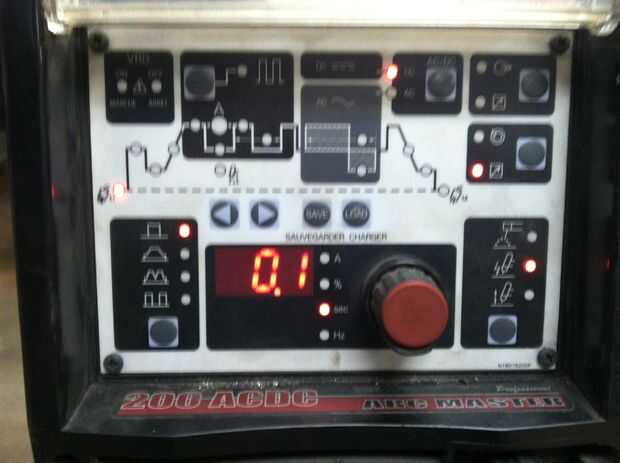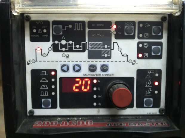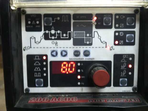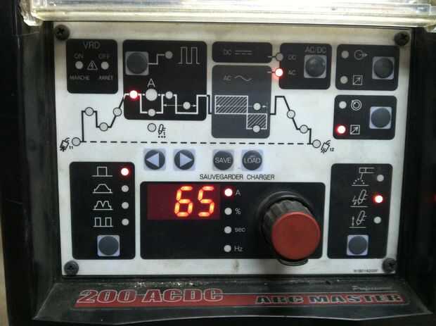 6) si vas a soldar con corriente continua, la máquina está lista. Si vas a soldar con CA, presione el botón AC/DC que se enciende el LED de la CA.