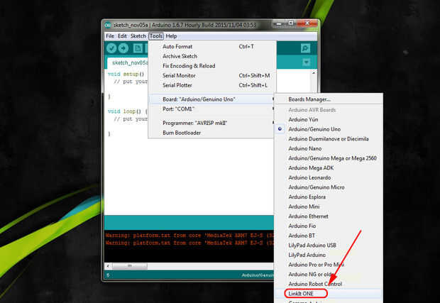 Ahora la parte dura realiza. Todo queda por hacer es seleccionar uno de LinkIt Junta en herramientas -> tabla de: "algo" -> un LinkIt y comience la codificación.