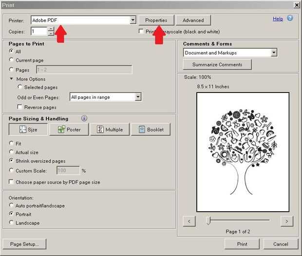Después de seleccionar el comando imprimir en el paso anterior, verá el cuadro de diálogo de impresión (véase arriba). Desde aquí, asegúrese de que la impresora escriba (primera línea del cuadro de diálogo) está establecida a Adobe PDF. Haga clic en el botón de propiedades a la derecha del tipo de impresora.