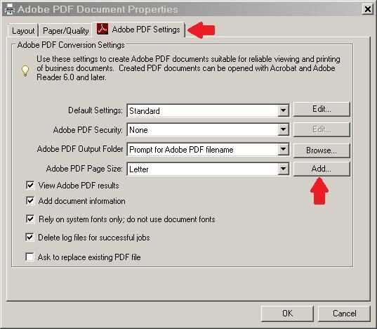 Haga clic en configuración de página en el paso anterior, abre el cuadro de diálogo Propiedades del documento Adobe PDF se muestran arriba. Asegúrese de que está seleccionada la ficha Configuración de PDF de Adobe. Ahora haga clic en el botón Agregar a la derecha de la configuración de tamaño de página de PDF de Adobe.