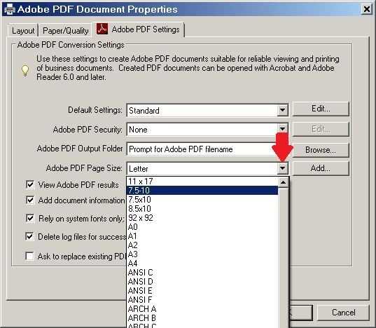 Después de crear su nuevo tamaño de página personalizado haciendo clic en Agregar/modificar son llevados de vuelta al cuadro de diálogo Propiedades del documento Adobe PDF. En el cuadro de diálogo, haga clic en la flecha desplegable para el campo de tamaño de página de PDF de Adobe. Ahora seleccione el nombre del tamaño de página personalizado que acaba de crear, 7.5-10, como se muestra arriba. Haga clic en Aceptar.