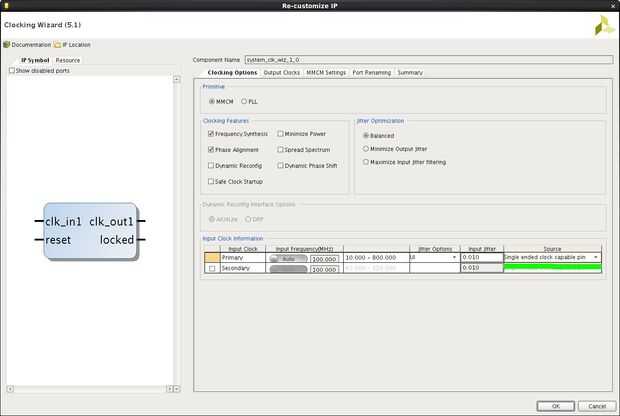 18. Haga clic en "Automatización de funcionamiento bloque" y elija /clk_wiz_1/clk_in1 pulse Aceptar