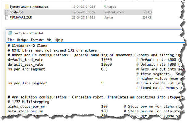 Configuración de Smoothieware se realiza en un archivo único config.txt que se guarda directamente en la SD, usando el Bloc de notas en lugar de un gran programa como el IDE de Arduino. La configuración de firmware se actualiza por ciclo de alimentación de la impresora o el envío de un comando de reset a él. Esto comparado con el Marlin con una gran cantidad de bocetos (archivos) necesitamos seguimiento de y modificar – ver foto para configuración de la impresora que estoy activamente actualizar aquí!