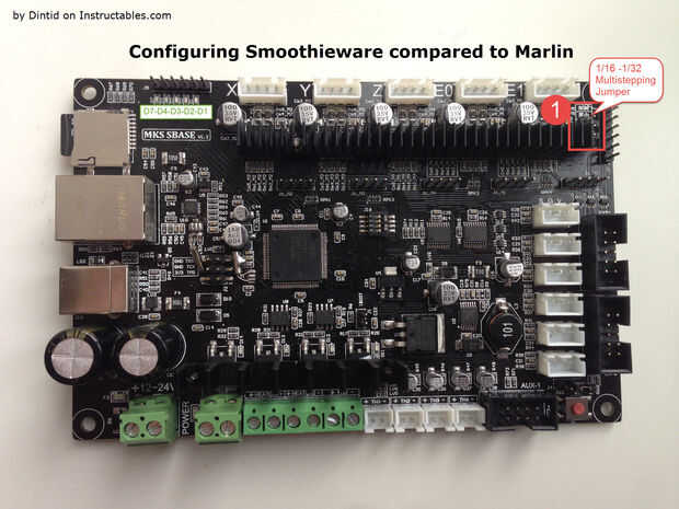 También Recuerde tener su multiplicador de microstepping en cuenta. Mi setup aquí se basa en 1/32 multistepping para tomar ventaja de la construcción en DRV8825 conductores. Puente de multistepping se coloca en la esquina superior derecha. (1)