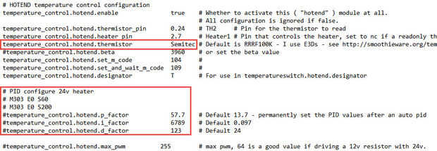 Cambiar el tipo de termistor usado. Estoy usando E3D hotend, que viene con un termistor de Semitec , por lo que tengo que cambiar eso.