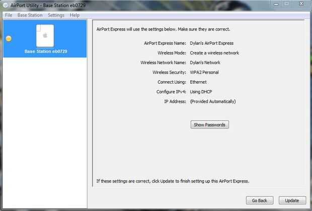 Ahora llevarán a una pantalla que le da una visión general de toda la configuración. Si usted quiere Compruebe su contraseña puede hacer clic en el botón Mostrar contraseñas y le dará la contraseña de la AirPort Express y su contraseña de red. Si usted quiere cambiar cualquier cosa que se puede volver, de lo contrario seleccione el botón actualizar. Apple crea actualizaciones muy a menudo por lo que este paso puede tardar unos minutos. Debe actualizar automáticamente y aplicarlas a tu router.