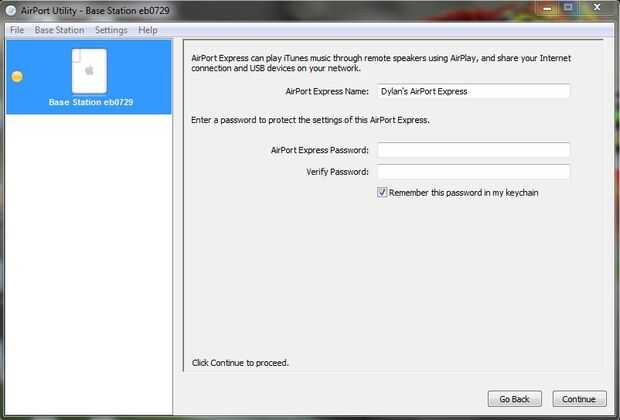 Abra Utilidad de AirPort, situado en el menú "Inicio". En la parte izquierda habrá una lista de los dispositivos. Lo más probable es que sólo tienes el router ahora mismo, que se etiqueta como estación base. Seleccionado la estación base y el Asistente de instalación le pedirá que nombre su AirPort Express y seleccione una contraseña. Es una buena idea para escribir esta información y mantener en sus registros. Luego presione continuar.