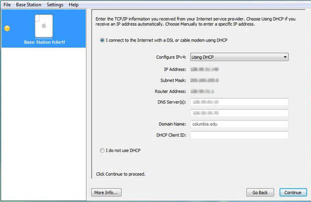Tengo cable y la mayoría de la gente tiene cable o DSL como su proveedor de internet, así que hice este paso en consecuencia. Si no, haga clic en la opción "No usar DHCP" y siga las instrucciones en pantalla. Para todo el mundo, seleccione conectado a Internet con un módem DSL o de cable utilizando DHCP, que es la primera opción. Si su enrutador y el módem estén correctamente conectadas, la utilidad de AirPort debe poder recibir una dirección IP automáticamente. Si no es así puede que necesite póngase en contacto con su proveedor de internet y escribir la información. Cuando acabado pulse continuar.