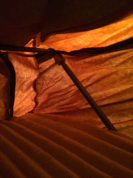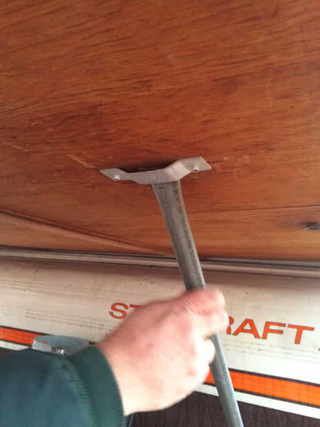 3. empuja la litera de arriba, deslice los polos en las ranuras en el camper, apuntalando así la litera.