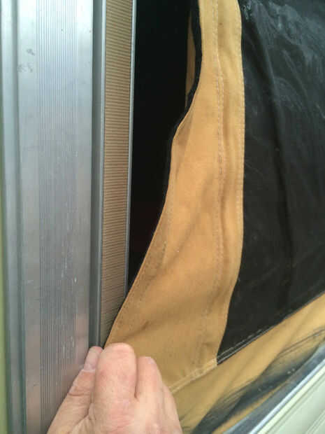 3. pivotar hacia abajo desde el techo y conectarlo en la parte inferior de la mitad de la puerta, usando las perillas para asegurar y el velcro para fijarlo.