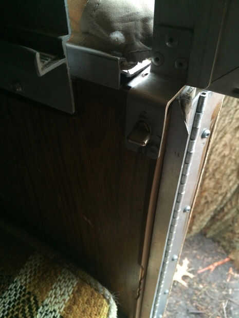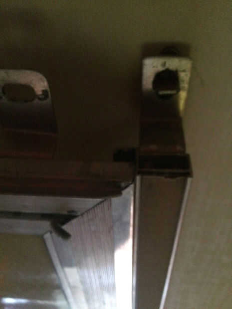 2. Tire hacia abajo de la mitad superior de la puerta desde el techo, girando las perillas para liberarla.