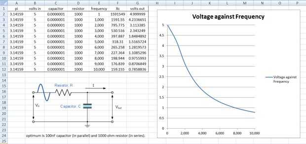 He tomado la fórmula final de la anterior y crea una tabla con voltajes calculados según se introducen lo que valores de resistencia y capacitancia. Las tensiones se trazan luego contra frecuencia para ver que frecuencias son 'separados' de la clavija de entrada de arduino.