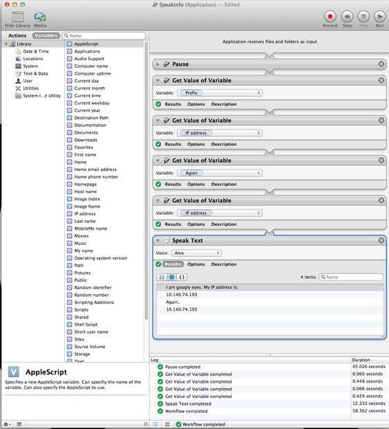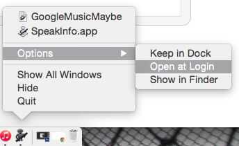 No he podido obtener una dirección IP estática, así que escribí una pequeña aplicación en Automator de Apple que hablará la IP dirección Mac en el altavoz interno 25 segundos después de que la máquina se enciende. Para usarlo, descarga el .zip y lo descomprimimos. Poner algún lugar seguro, como/aplicaciones/SpeakInfo.app. Arrástrelo hasta el muelle. Haga clic con el botón derecho el icono y seleccione Opciones > abrir en el inicio de sesión. Se debe ejecutar una vez botas de unos 30 segundos después de la Mac.