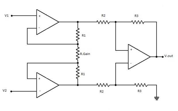Es el diagrama de circuito interno para el LM 324 amplifing chip y también el diagrama del circuito para un amplificador de instrumentación.