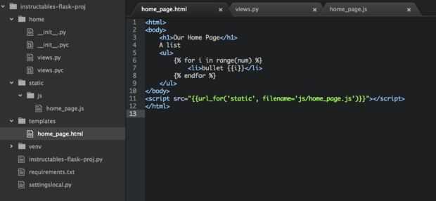 <html> <body> <h1>Our Home Page</h1> A list <ul> {% for i in range(num) %} <li>bullet {{i}}</li> {% endfor %} </ul> </body> <script type='text/javascript' src="{{url_for('static', filename='js/home_page.js')}}"></script> </html> Puedes ver el resultado en la imagen de arriba. Tenga en cuenta el uso de las llaves dobles y rizado por ciento de apoyo, estos se utilizan para las plantillas. Matraz utiliza un marco llamado "Jinja2", que utiliza estos símbolos. Las plantillas le permite pasar variables a la página html y controlar lo que es parece que antes de ser enviados a un navegador. Esto es muy potente, y puedes leer más aquí