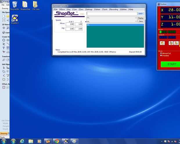 -La fresadora debe mantenerse en una caja fuerte altura encima de la mesa después de ser puesto a cero, sin embargo, si fuera necesario, elevar el router con seguridad por encima de la mesa (ej. MZ2 o utilice el panel de control de la palanca)-MH llame en 3 Shopbot para devolver el router a la casa de X e Y