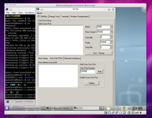 Después de todo lo ha descargado, ejecute vino y el ejecutable XCTU de DIGI. (Ver foto 1). Una vez instalado, usted tendrá que crear un enlace simbólico entre/dev/ttyUSBx (x: 0,1,2,3) y COM0x (x: 0,1,2,3). No te preocupes si no existen ahora. /dev/ttyUSBx existirá después de conectar su chip fdti-usb para el XBee.