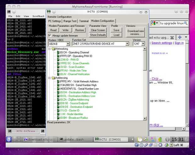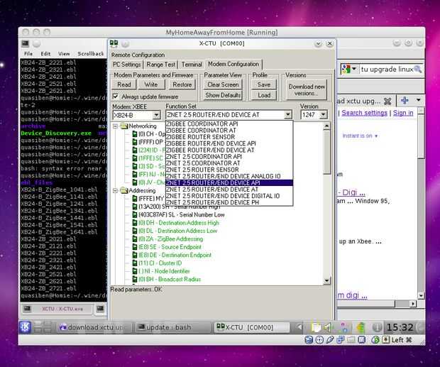 Ahora que XCTU corre tenemos que volver a configurar el dispositivo para el modo API. Primero haga clic en configuración del módem (parte superior derecha puedes) y haga clic en el botón Read (Foto 1). En el menú desplegable seleccione ZNET 2.5 ROUTER/END dispositivo API (Foto 2). Haga clic en escritura y esperar a que la escritura acabados. Un cuadro de diálogo puede pop-up y pida que reinicie el dispositivo. Si este es el caso y usas un XBee LilyPad Breakout, simplemente conectar la clavija de menos en el pin RST y liberación. Después de volver a configurar, haga clic en la prueba y botón de consulta para confirmar que ha sido el XBee reconfigurar (Foto 3)