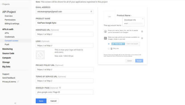 3. ir a pantalla de consentimiento y allí elegir la dirección de correo electrónico y nombre de un producto de entrada (puede ser anyting, acaba de poner KeePass Google Sync) el resto déjalo como está y golpear guardar botón en la parte inferior de la página. (Esto arregla el ERROR de invalid_id). Ver la última imagen.