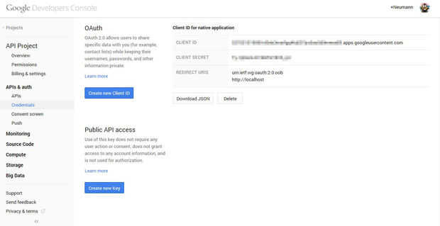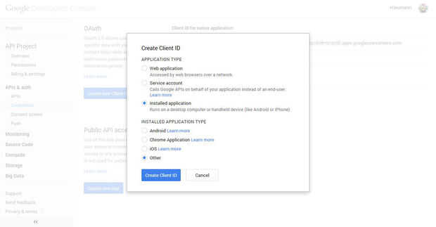 1. ir a las credenciales desde el menú de la izquierda y allí elegir crear nuevo ID de cliente el OAuth 2.0 y elija aplicación instalada y tipo de aplicación instalado haga Presione ID crear cliente. Ver la primera imagen.