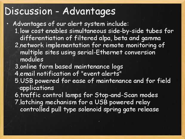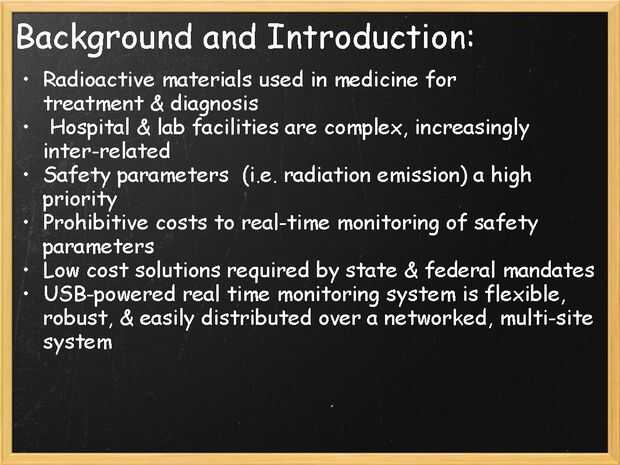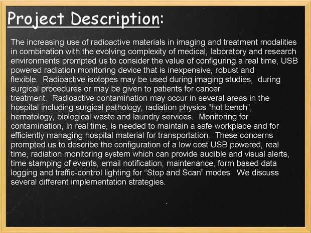 El creciente uso de materiales radiactivos en las modalidades de la proyección de imagen y tratamiento en combinación con 1) la evolución complejidad (e integración) de médicos, investigaciones de laboratorio y ambientes y 2) el potencial para contaminación de E-Waste moniotoring ha llevado a considerar el valor de la configuración de un tiempo real, radiación powered USB control de dispositivo que es barata, robusta y flexible. Racional: Isótopos radiactivos pueden utilizarse durante la proyección de imagen estudia, durante procedimientos quirúrgicos o pueden administrarse a los pacientes para el tratamiento del cáncer. Contaminación radiactiva puede ocurrir en varias áreas en el hospital como patología quirúrgica, radiación física "caliente Banco", hematología y manejo de residuos biológico. Monitoreo de contaminación en tiempo real, es necesario para mantener un lugar de trabajo seguro y para la gestión eficiente de material de hospital para el transporte. En respuesta a estas consideraciones que hemos descrito la configuración de un bajo costo USB accionado, tiempo real, sistema que puede proporcionar alertas audibles y visuales, sellado de los acontecimientos, el tiempo de monitoreo de radiación correo electrónico notificaciones, registros de mantenimiento, forman la base de registro de datos y de iluminación para "Parar y analizar" los modos de control de tráfico. Se discuten varias estrategias de implementación diferente del prototipo.