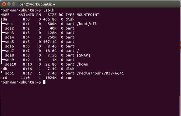 - Enchufe tarjeta Micro SD en el ordenador (con un adaptador si es necesario). Pulse lsblk y tenga en cuenta que no estaba allí antes. Para mí, el sdb es la tarjeta Micro SD.