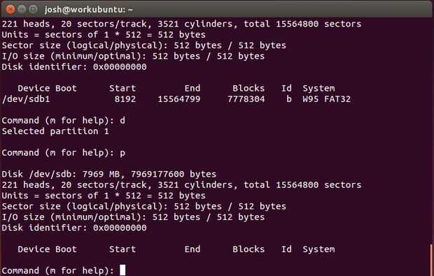 - Después de habrán sido desmontadas de todas las particiones de la tarjeta Micro SD, nos podemos (re) particionar usando el comando fdisk .- Introduzca el comando sudo fdisk /dev/sdb. Con esto iniciará el menú de fdisk funcionando.
