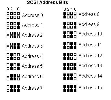 Dispositivo IDs son una de las partes más importantes en el sistema SCSI. Si un dispositivo no tiene uno no se puede abordar el autobús. Si es igual a otro que ni dispositivo funcionará correctamente. La configuración de un ID de dispositivo puede variar sin embargo normalmente se hace en cualquier firmware (esto es común para el control remoto), o por un puente, interruptor, interruptor de número. En firmware escriba el firmware utilizando la clave especificada en el arranque o la documentación del producto. Este probablemente será sólo para el controlador. Las unidades se establecen lo contrario. Un esquema de la unidad o en la documentación demostrará los pines a utilizar. Para configurar un hallazgo ID el pin con el número deseado como 2 pone un jumper en los pines correspondientes tal como se ilustra en el diagrama. (Dispositivos más externos usarán un formato de 2 botones con una rueda con números en ello este número es el ID SCSI en ese dispositivo. Hay 2 rangos de ID de 0-7 y 8-16. Algunos sistemas sólo permiten 8 dispositivos por lo que se utiliza la primera de ellas, otra cosa pueden todos ser utilizados. Esto depende principalmente de la SCSI estándar. Esto depende de si el bus SCSI es 8 o 16 bits amplia. Éstos utilizan 0-7 o 0-16 respectivamente.