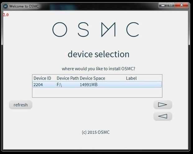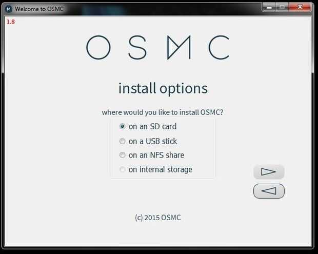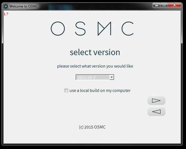 El instalador le pedirá ahora a elegir la versión de la OSMC, en el menú (imagen 1.7) desplegable elija la última opción que estará la versión más reciente y más estable, y luego haga clic en la flecha siguiente.