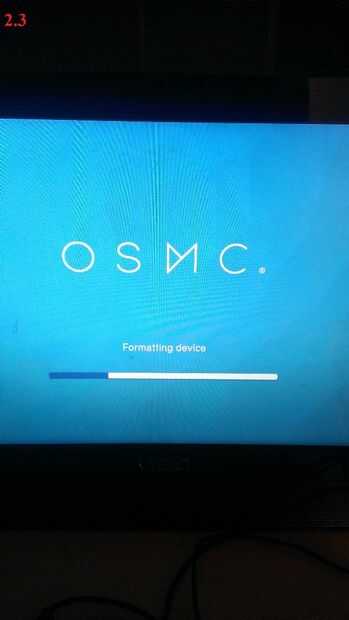 Debería ver una pantalla de la OSMC y una barra de carga, dejó el formato (cuadro 2.3) y acabado de la instalación (cuadro 2.4).