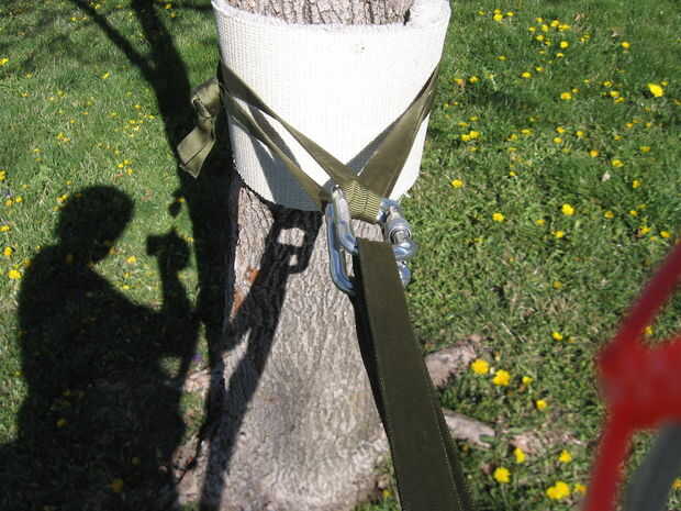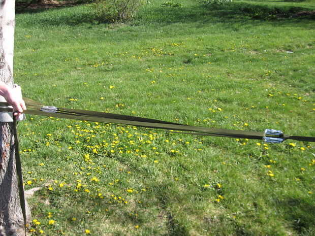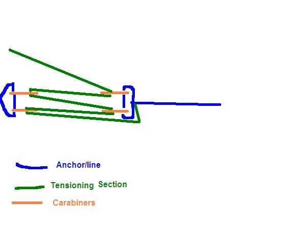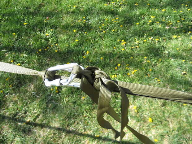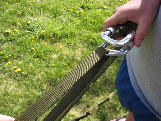 Mantener tensión en la línea, atar al menos tres medios nudos alrededor de la cinta que está entre los conjuntos de los mosquetones. Te recomiendo tyeing en algo, este hacen tomando la línea mucho más fácil.