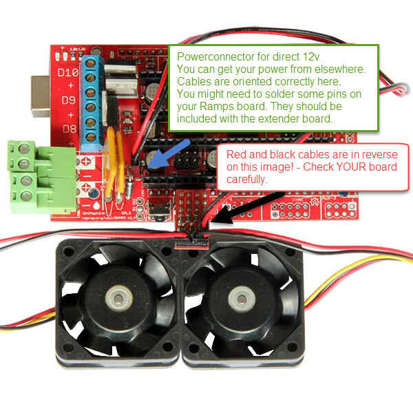 Cuando el tablero de suplemento está instalado en rampas y en la misma orientación como arriba, la de 12 voltios va al pin superior en el tablero de extensión. Debe haber un pequeño + para mostrarlo. La imagen de Geetech tiene este cable instalado al revés!