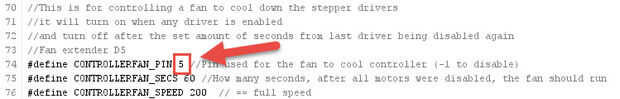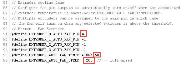 Cambiar el-de 1 a 4 después de EXTRUDER_0_AUTO_FAN_PIN como se muestra en la imagen.