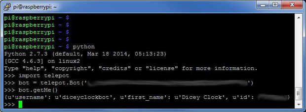 Si el último comando, getMe(), devuelve un diccionario que describe la cuenta del bot (como en el pantallazo), todo es bueno. Tipo exit() dejar al intérprete de Python.