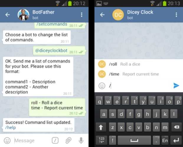 Después de eso, salir del telegrama. Fuerza-para lo que quiera. Abra de nuevo y vaya a la página de tu bot (no BotFather, pero tu propio bot). Escriba una barra diagonal (/) y usted debería ver algo como la imagen derecha superior - telegrama mostrará una lista de los comandos para usted. Sólo tienes que aprovechar en él.