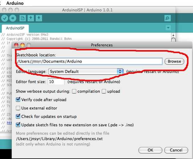 Busque la carpeta sketchbook para sus programas de Arduino. Esta carpeta generalmente aparece en el menú de preferencias. Ir a la barra de herramientas superior, seleccione Arduino, desplácese hacia abajo y elija Preferencias... La ventana emergente debe mostrar la ruta del archivo a la carpeta sketchbook.