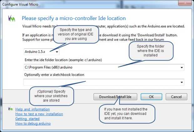 Si es la primera vez después de instalar Arduino para Micro Visual, el administrador de configuración aparecerá donde puede configurar el sistema. Micro visual debe conocer la ruta de instalación y versión del software de Arduino que tengas instalado previamente, vea la introducción página, paso 1. Esto también se aplica a IDEs similares como mpIDE o Energia.