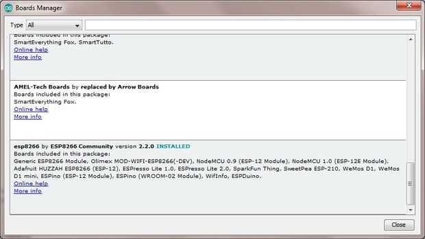 Desde el diálogo 'Tableros Manager', localizar la entrada para ESP8266 por la comunidad de ESP8266 (era justo en la parte inferior para mí) y seleccione 'Install' (el botón a la derecha). En el momento de escribir v2.2.0 fue el más reciente. Nota: Puede tardar algún tiempo, hay mucho para descargar.