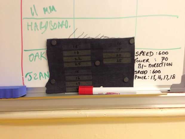 Necesita para su configuración de captura. Lo que hice fue documentar mi denim de prueba mediante el uso de un marcador es y escribir la configuración de energía directamente en el dril de algodón, esto se ahora ha publicado en nuestro muro de sala de láser para que todos puedan usar y modificar.