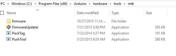 Existe la posibilidad de que la Junta que reciba va a necesitar el firmware actualizado. Hacerlo es extremadamente simple porque todo lo que necesitas hacer es encontrar la carpeta de Arduino en su computadora e interior será otra carpeta llamada hardware, dentro de esa carpeta pero otra carpeta llamada herramientas luego dentro de esa carpeta otra mtk que sostiene el actualizador de firmware. Para utilizar esta herramienta todo lo que necesitas hacer es conectar la placa a uno de los puertos USB y haga clic en el botón verde grande a la derecha y se actualizará a sí mismo.